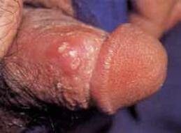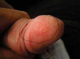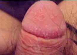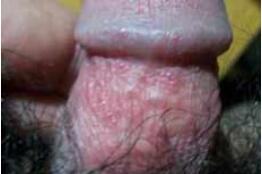 龟头起丘疹和龟头红点,逐渐扩大,边缘清楚,红斑上可见针头大小的小水疱,形成糜烂面。