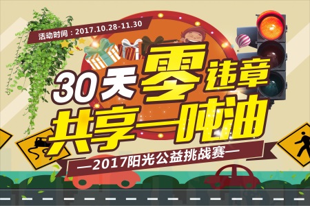 温馨提示:本次“30天零违章,共享一吨油”阳光公益挑战赛,活动日期从2017.10.28到2017.11.30止,了解更多活动详情,点击【咨询客服】。
